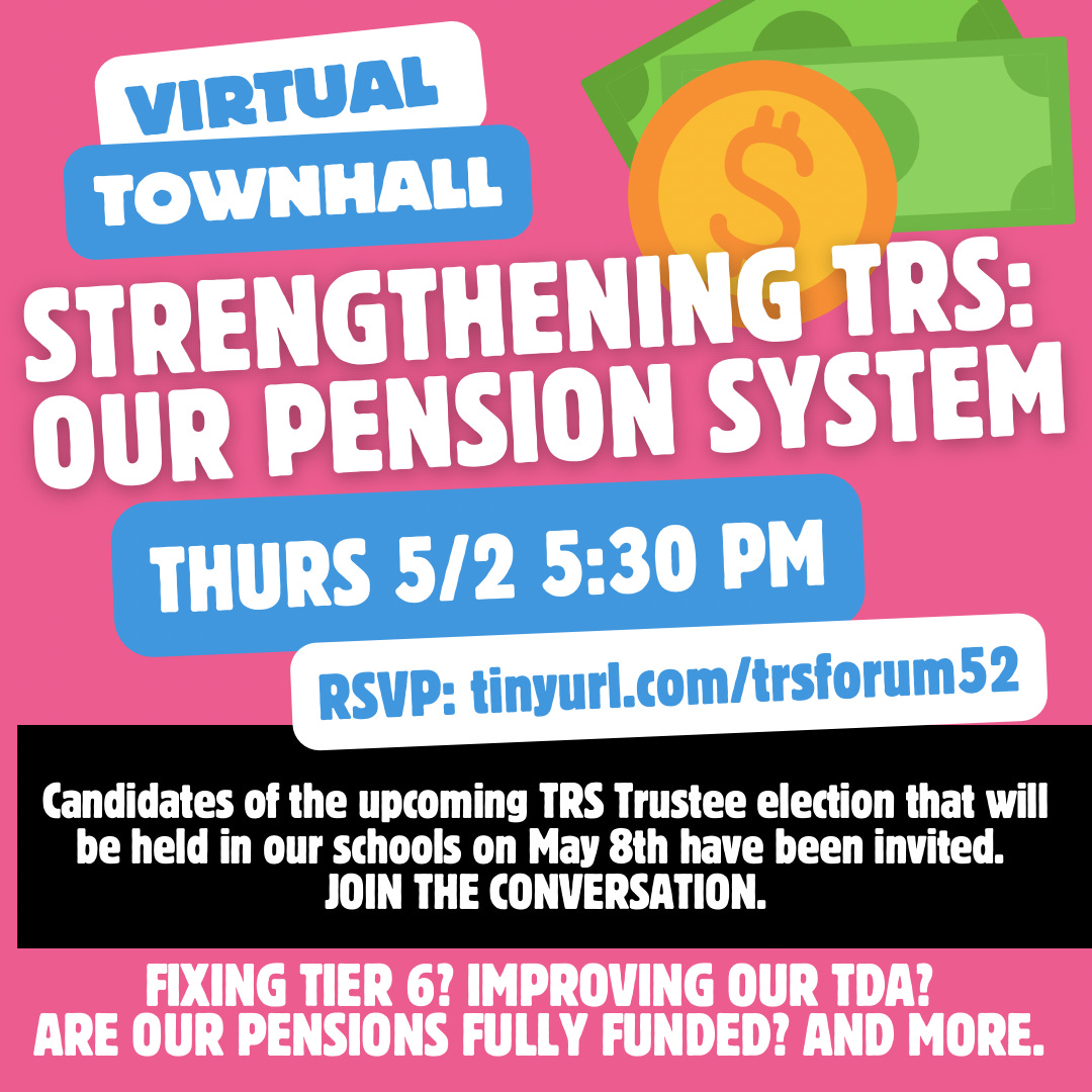 Join the ‘Strengthening TRS: Our Pension System’ virtual town hall on Thurs, 5/2 at 5:30 PM
