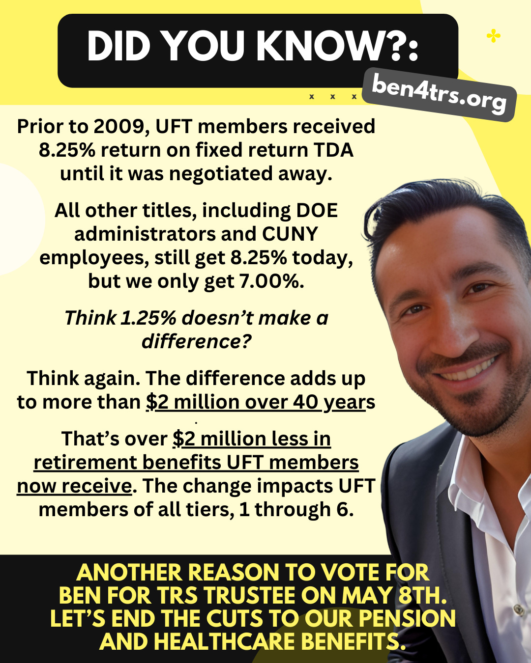 Are you aware that members of all tiers are losing up to 2 million dollars in their retirement earnings because of the 2009 Unity-UFT giveback that lowered our TDA rate to 7% from 8.25%? That other city employees still get the 8.25% TDA rate?