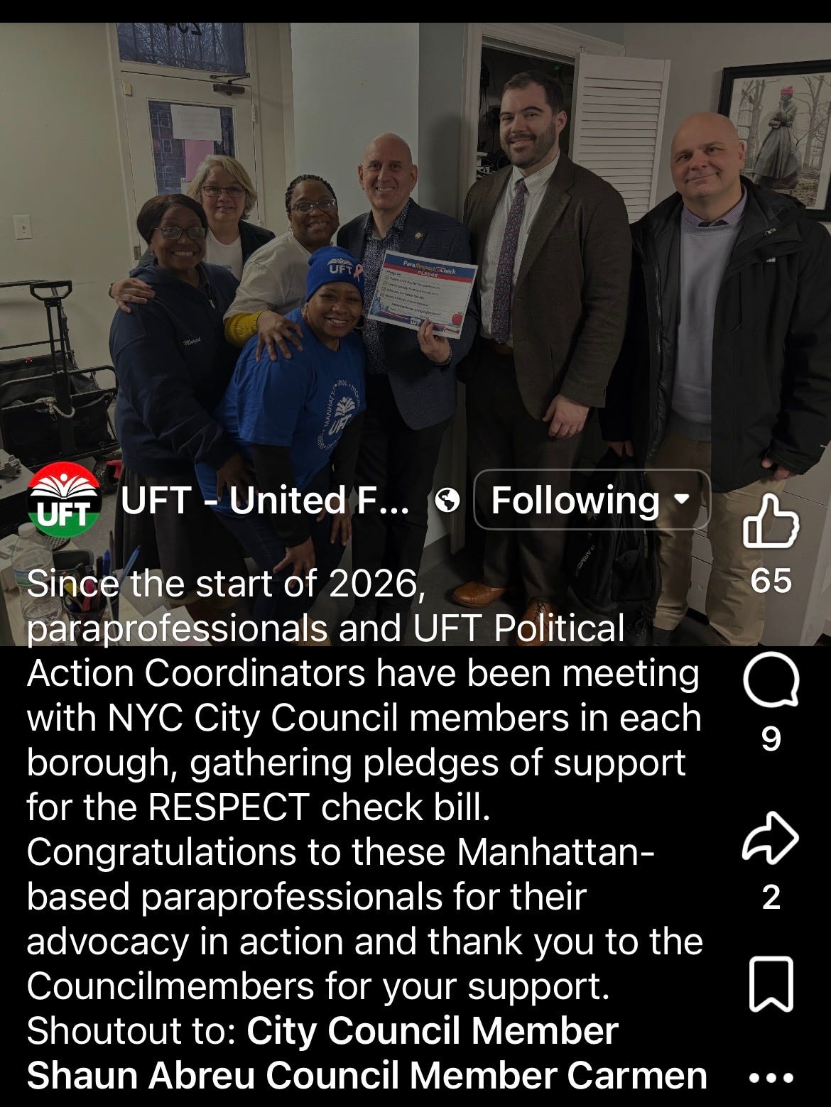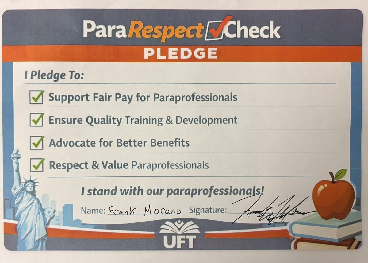 Alongside the revived bill, UFT leadership, to their credit, has rolled out a coordinated push bringing paraprofessionals face to face with City Council members. Social media posts celebrate “pledges of support” secured borough by borough. The optics are strong: paras in union gear, council members smiling, pledge cards in hand.