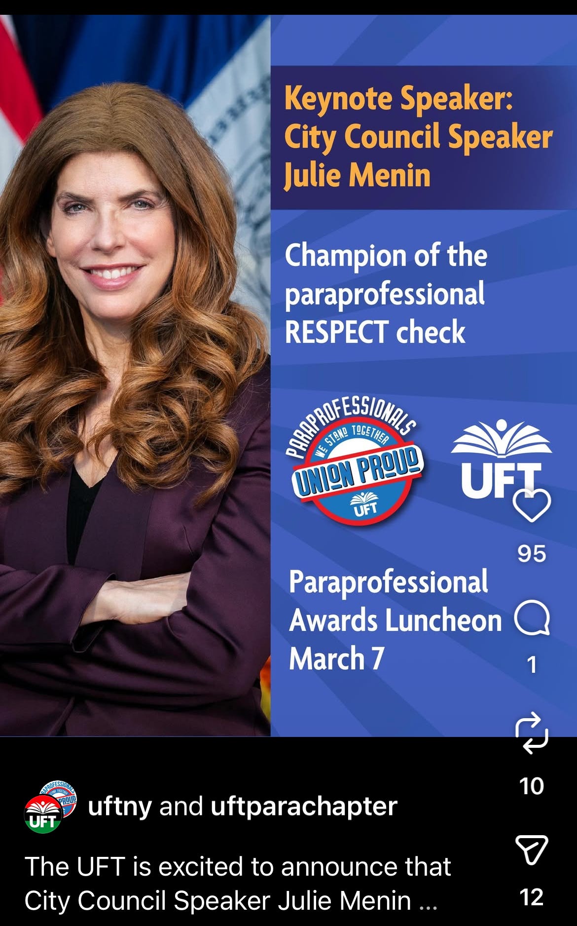 Now she is publicly branded by the union as the “Champion of the Paraprofessional RESPECT Check.” She is headlining this year’s UFT para awards luncheon.